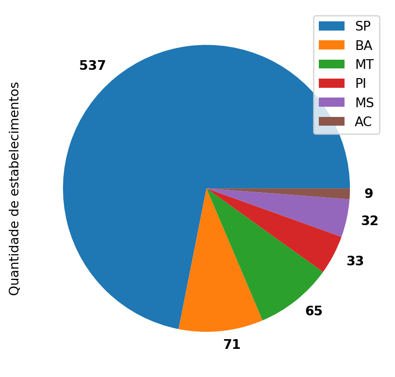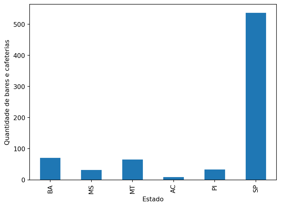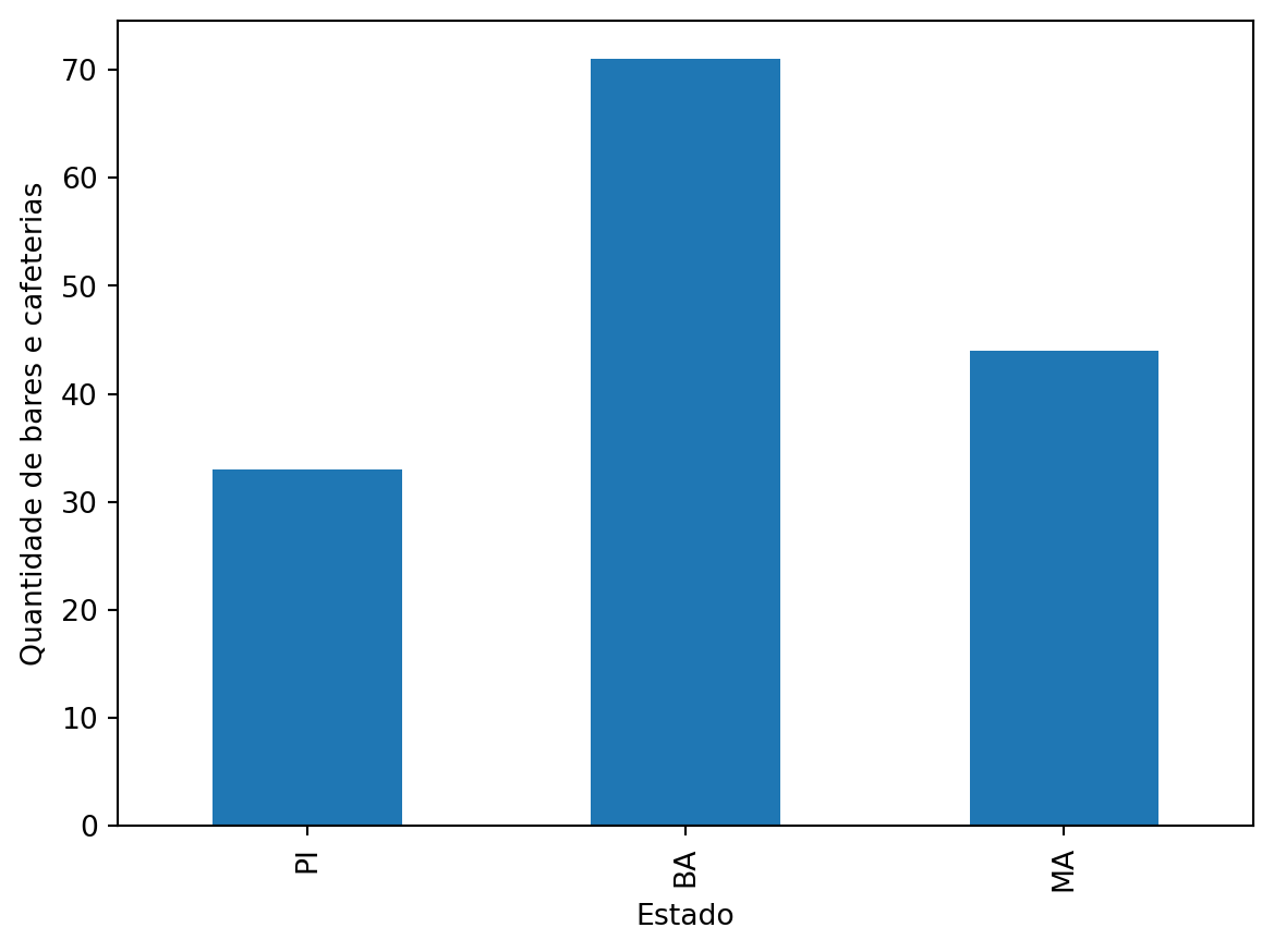 Um dos gráficos mais simples, um gráfico de barras é útil para visualizar dados categóricos. Abaixo, vemos um gráfico do número de bares e cafeterias em três estados brasileiros cadastrados no último trimestre de 2024.