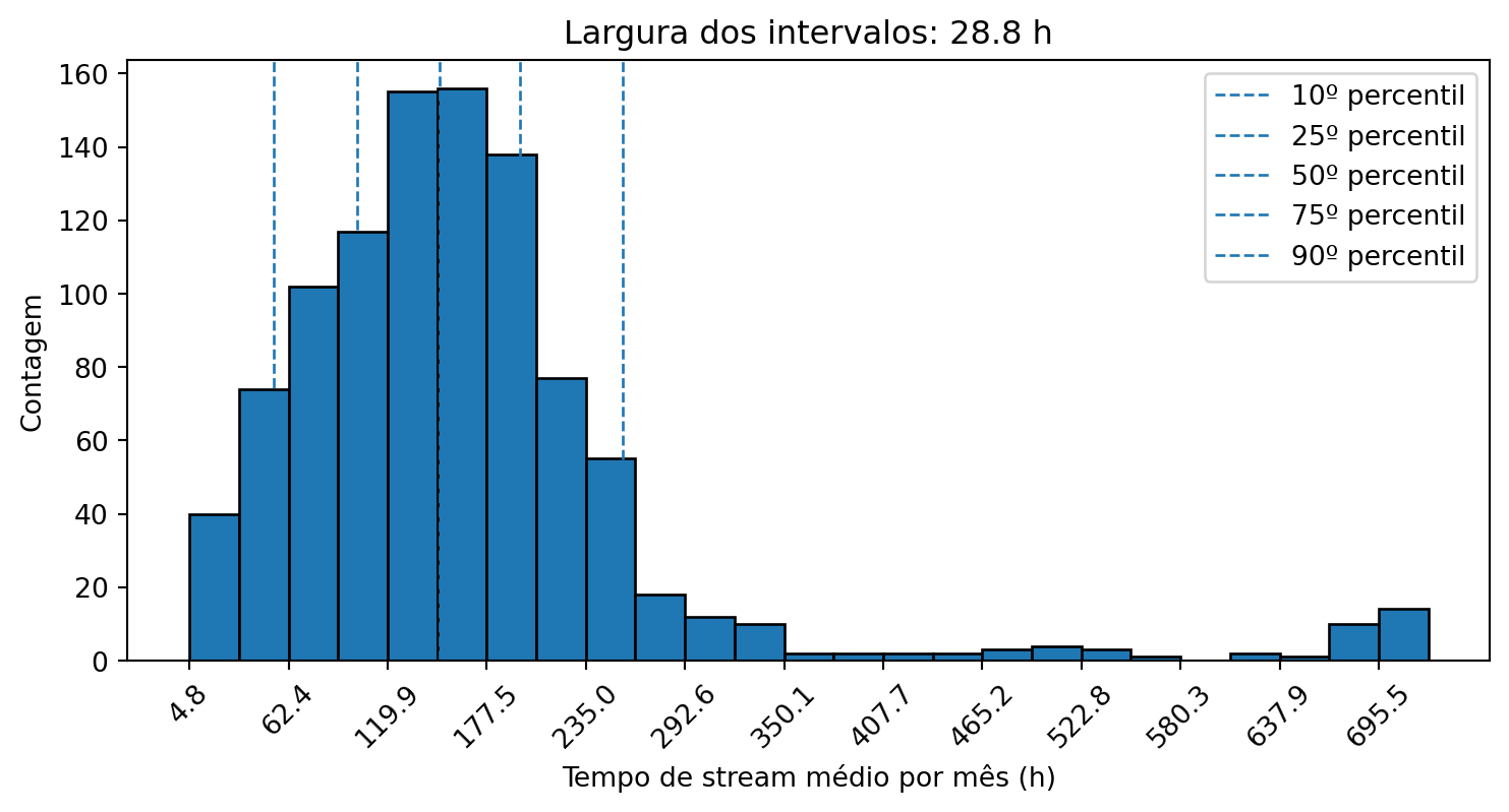 Por exemplo, vemos abaixo um histograma sobre duração média de horas de transmissão por mês dos maiores streamers da Twitch em 2024 combinado com linhas de percentis.