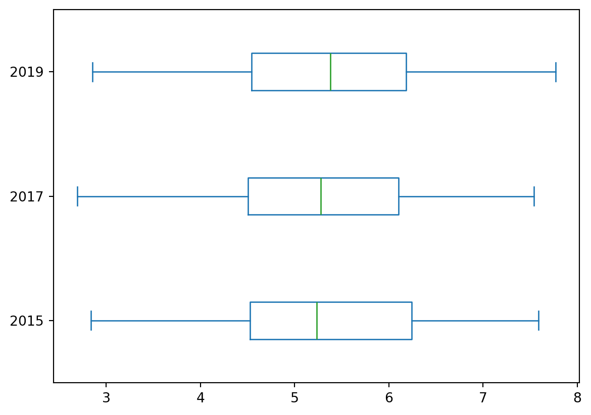 Gráficos de caixas (ou boxplots) são úteis para visualizar distribuições. A seguir, temos um exemplo mostrando a distribuição do índice de felicidade de diversos países ao longo dos anos.