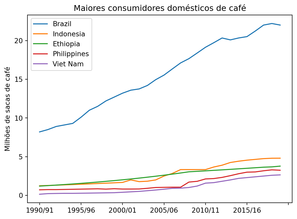 Gráficos de linha também são chamados de gráficos de tendência e são particularmente úteis para visualizar a evolução de uma variável numérica ao longo do tempo. A seguir temos um exemplo ilustrando o crescimento do consumo doméstico de café de diversos países.