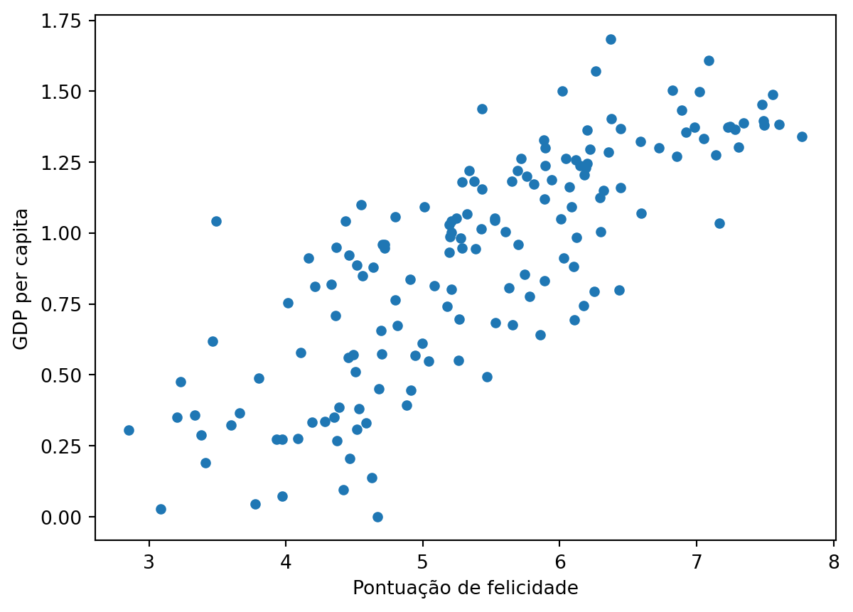 Gráficos de dispersão permitem visualizar o relacionamento entre mais de uma variável. Abaixo temos um exemplo da relação entre o PIB per capita e a pontuação de felicidade do relatório mundial.